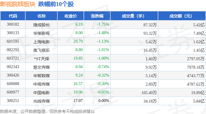 证券之星音讯,11月11日影视院线%,美好蓝海领涨。当日上证指数报收于4002.76,跌落0.39%。深证成指报收于13289.0,跌落1.03%。影视院线板块个股涨跌见下表: