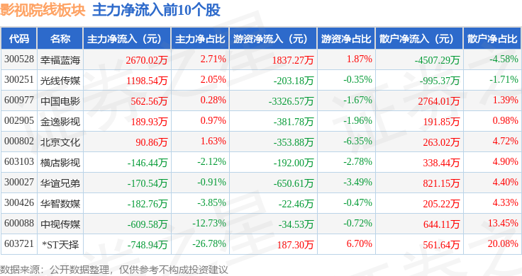 从资金流向上来看,当日影视院线万元,散户资金净流入2.24亿元。影视院线板块个股资金流向见下表: