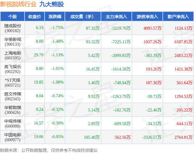 个股表现方面,影视院线行业当日领跌股为捷成股份(300182),该股当日报收6.19,下跌1.75%,成交量87.32万,主力资金净流出5219.7万元。华策影视(300133)以下跌1.48%紧随其后,该股当日成交量93.32万,主力资金净流出7225.11万元。除此之外,上海电影(601595)、奥飞娱乐(002292)、*ST天择(603721)均进入当日熊股之列。具体个股列表见下表: